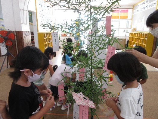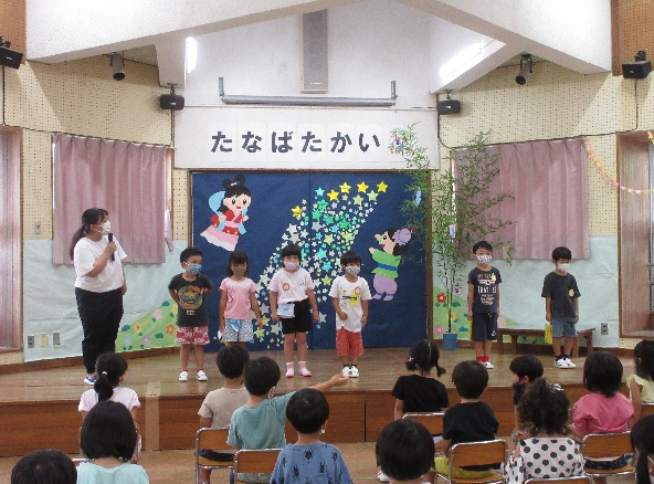 「たなばたさま」の歌を歌うと各クラスの代表者が短冊に書いた願いを発表しました。