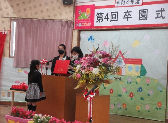 3月15日(水)、令和4年度の卒園式がありました。卒園証書授与では、将来の夢を堂々と発表することが出来ました。また、園長先生や大庭学園理事長、保護者会長から心のこもったお祝いのメッセージも頂きました。