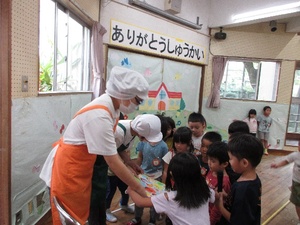 11月23日(土)は勤労感謝の日ということで、いつも美味しい給食を作っている調理師さんをお招きして、21日(金)にありがとう集会を行いました♪ありがとう集会では、勤労感謝の日についてお話を聞いたり、インタビューをしたりと楽しく交流ができました(*^▽^*) いつも美味しい給食ありがとうございます!給食を作っている方に、お会いすることができ良い機会になりました♪